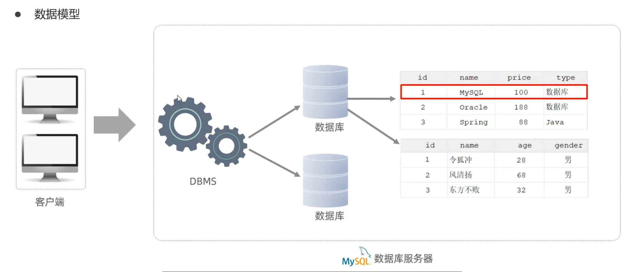 客户端通过DBMS操作数据库,数据库中有多张表,如此串联操作。