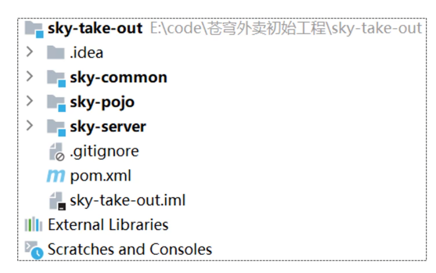 | sky-take-out | Maven 父工程,统一管理依赖版本,聚合其他子模块 |