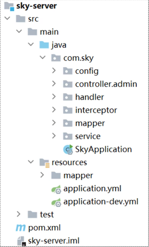 | sky-server | 子模块,后端服务,存放配置文件、Controller、Service、Mapper 等 |